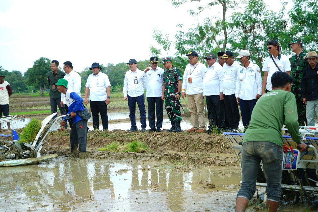 Pada kesempatan itu, dilakukan penanaman padi menggunakan mesin transplanter dan penyemprotan menggunakan drone.
