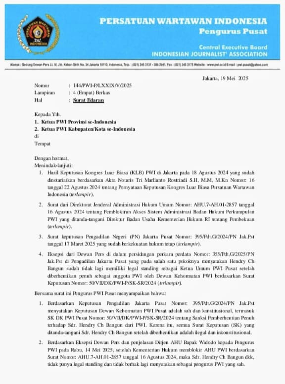 Dalam surat tersebut, PWI Pusat menegaskan bahwa semua keputusan dan surat yang ditandatangani Hendry Ch Bangun setelah pemecatannya dianggap ilegal dan inkonstitusional.