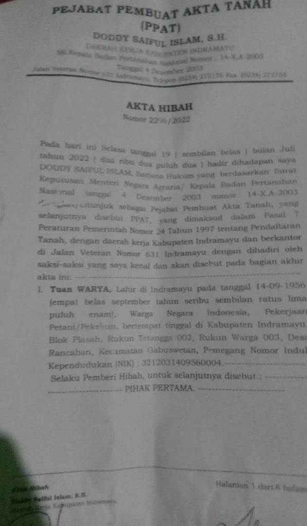 Indramayu//globalpena.com – Adanya Dugaan Praktik Penyalahgunaan Wewenang serta pemalsuan Dokumen Akta Hibah di tengah pesta Demokrasi yang terjadi di Kabupaten Indramayu ikut mewarnai Jagat raya yang terjadi di wilayah Desa Rancahan, Kecamatan Gabus Wetan.